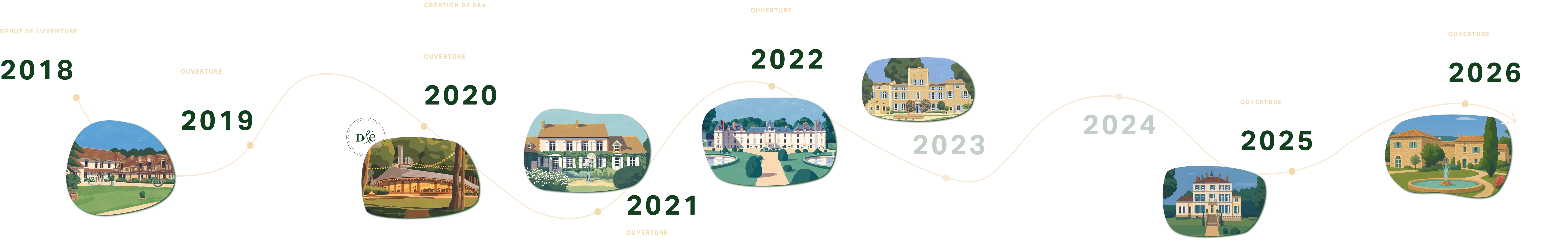 Après la Thibaudière, dans l’Ouest parisien, en 2019, le second domaine arrive très vite, la Roche Couloir, en forêt de Chevreuse au printemps 2020 (sic), puis le Domaine de Vaujoly, près de Chartres fin 2020, le Château d’Aveny, dans le Vexin en 2021(en co-propriétaire), le Château des Barrenques, en Provence en 2022, le Château du Grand Morin, en Seine-et-Marne en juin 2025 et le Domaine de la Vivande, prévu pour juin 2026.